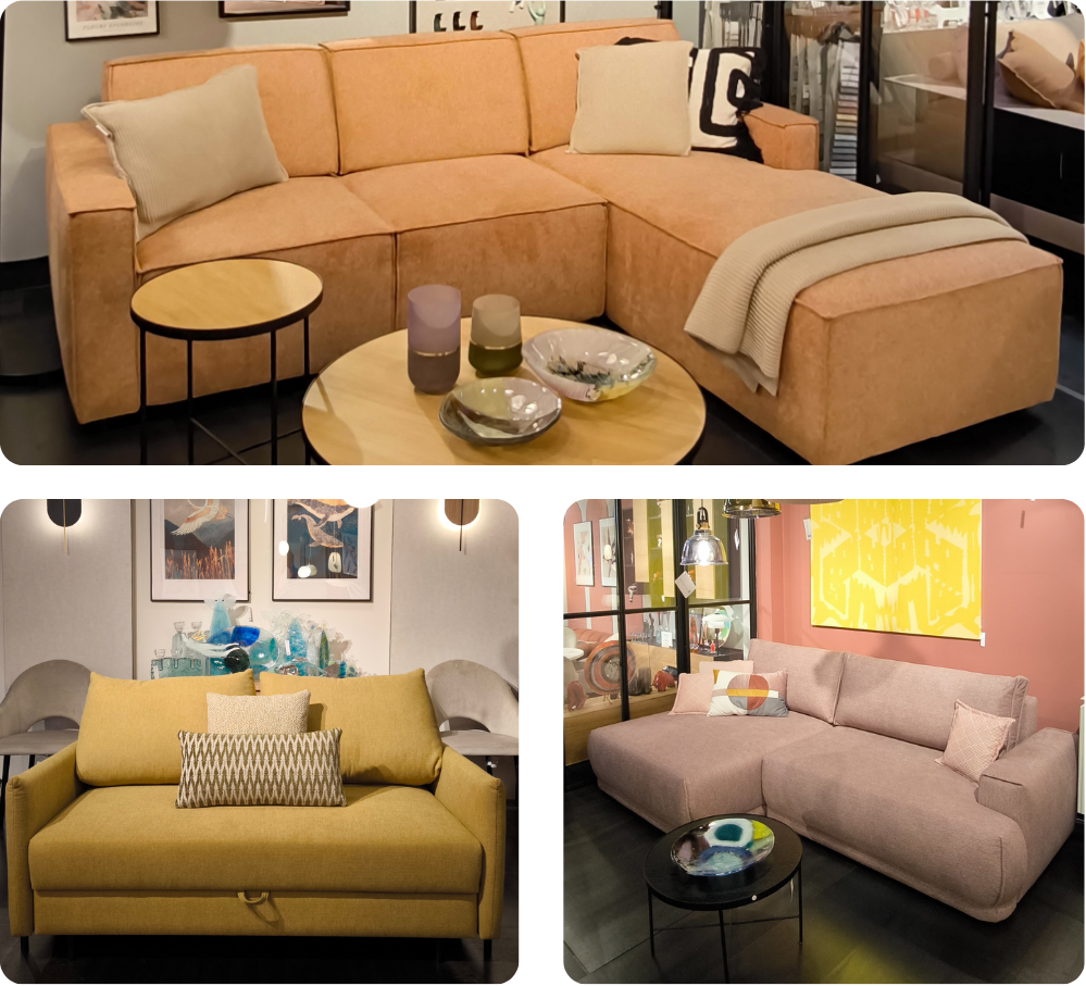Meble na ekspozycji: narożnik Merano, sofa Helios, sofa Madera.