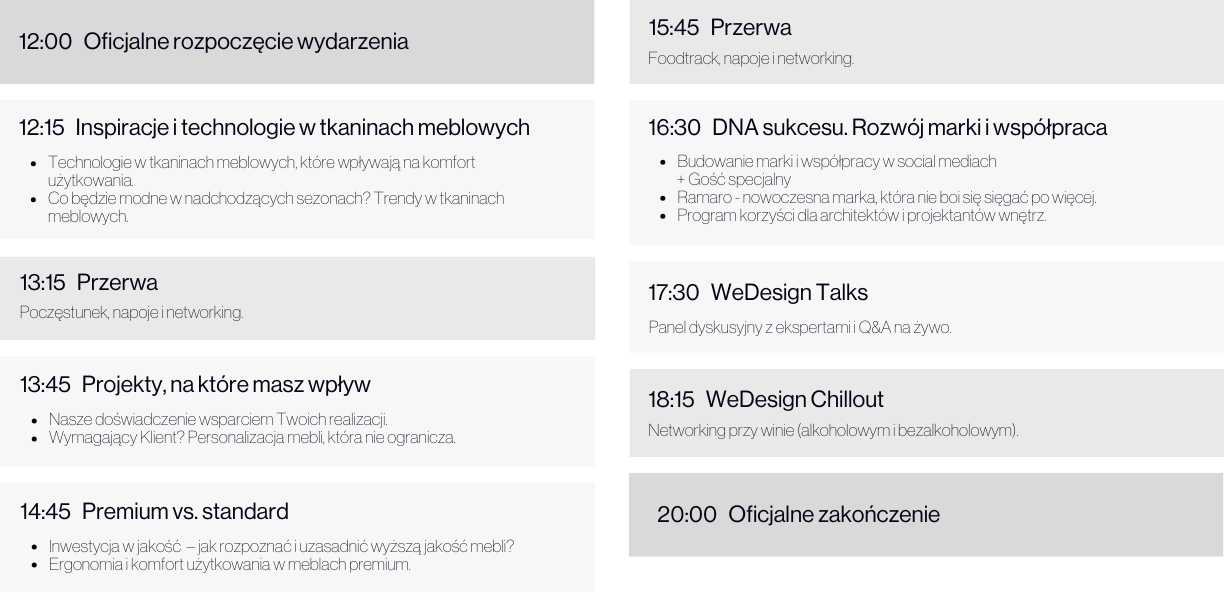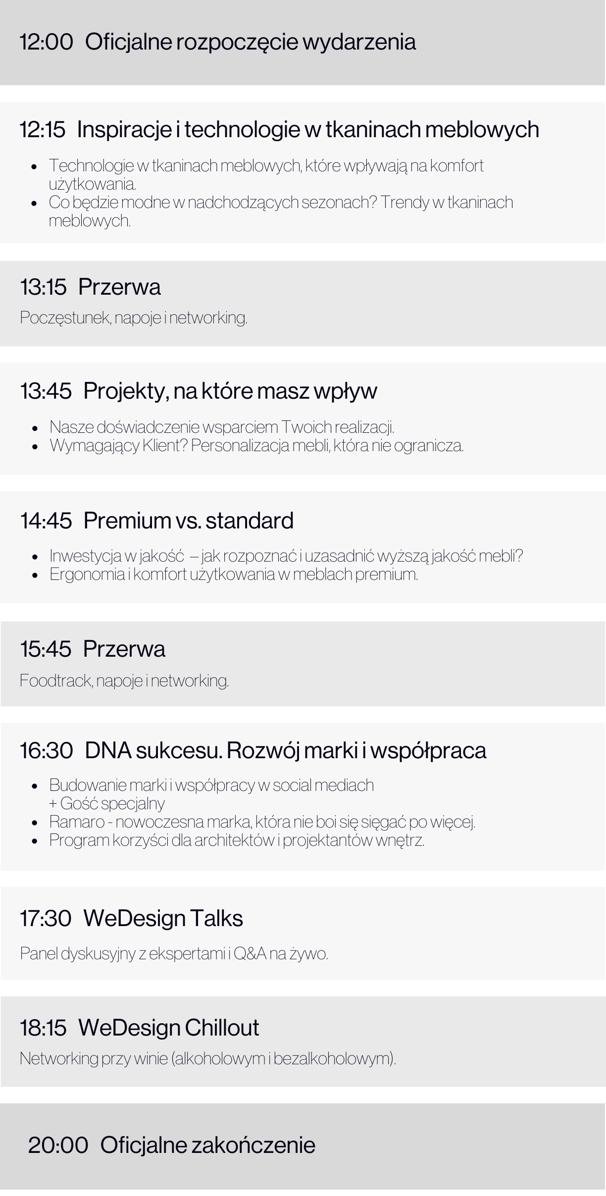 WeDesign to wyjątkowe wydarzenie stworzone z myślą o architektach i projektantach wnętrz, organizowane przez Ramaro. W sercu naszego showroomu tworzymy przestrzeń do inspirujących rozmów o meblach, trendach, nowościach produktowych i wyzwaniach branży projektowej.